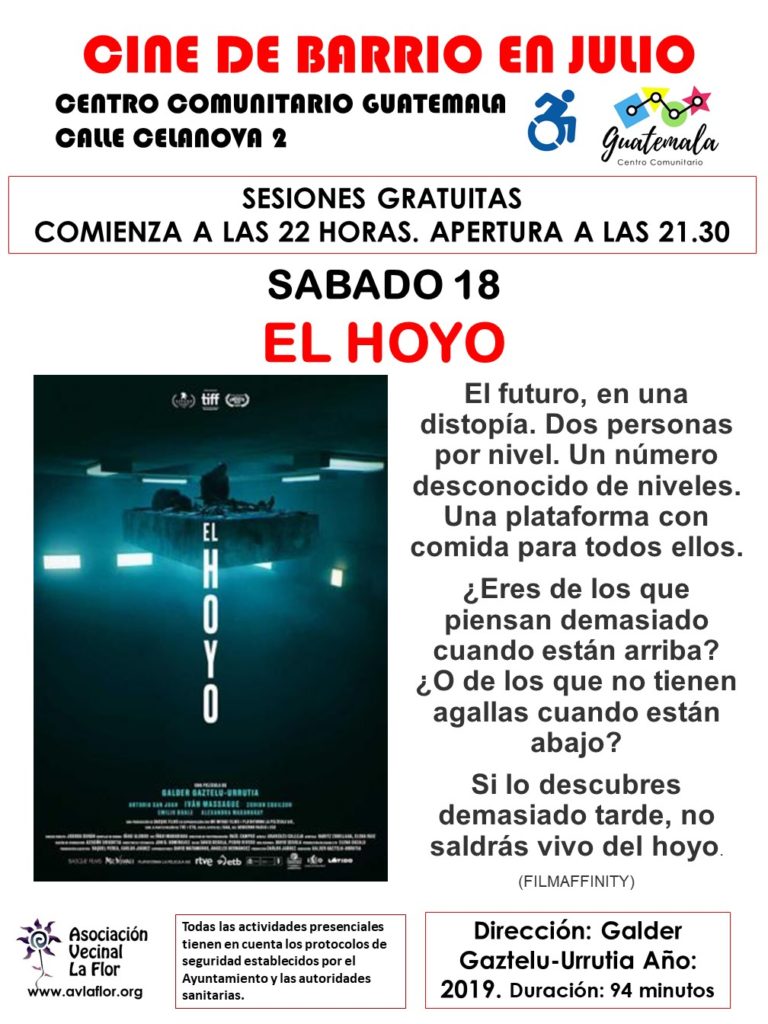 En esta ocasión, y tras el éxito de nuestra primera cita, volvemos con otra película, esta vez de tinte futurista: El Hoyo, con una duración de 94 minutos. Ya sabéis, al aire libre, en el Centro Comunitario Guatemala.