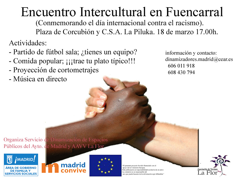 Aprovechando esta conmemoración, algunas entidades del distrito de Fuencarral organizamos un encuentro convivencial entre culturas el próximo domingo 18 de marzo, a partir de las cuatro de la tarde en la plaza de Corcubión.