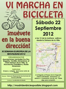El próximo sábado 22 de septiembre tendrá lugar la marcha reivindicativa que anualmente organizamos diversas entidades ciudadanas de los barrios del norte de Madrid exigiendo medidas suficientes para facilitar la movilidad en bicicleta como medio de transporte no contaminante.