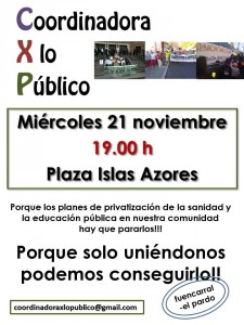 El miércoles 21 de noviembre a las 7 de la tarde, la Coordinadora X lo Público (cXp) se presenta en un acto en la Plaza Islas Azores.