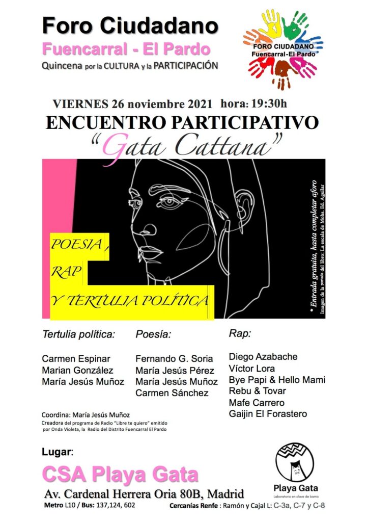 El viernes 26, desde el Foro Ciudadano se organiza una jornada cultural en el CSA Playa Gata, en torno a la figura de Gata Cattana, una rapera feminista que falleció hace poco a la edad de 26 años.